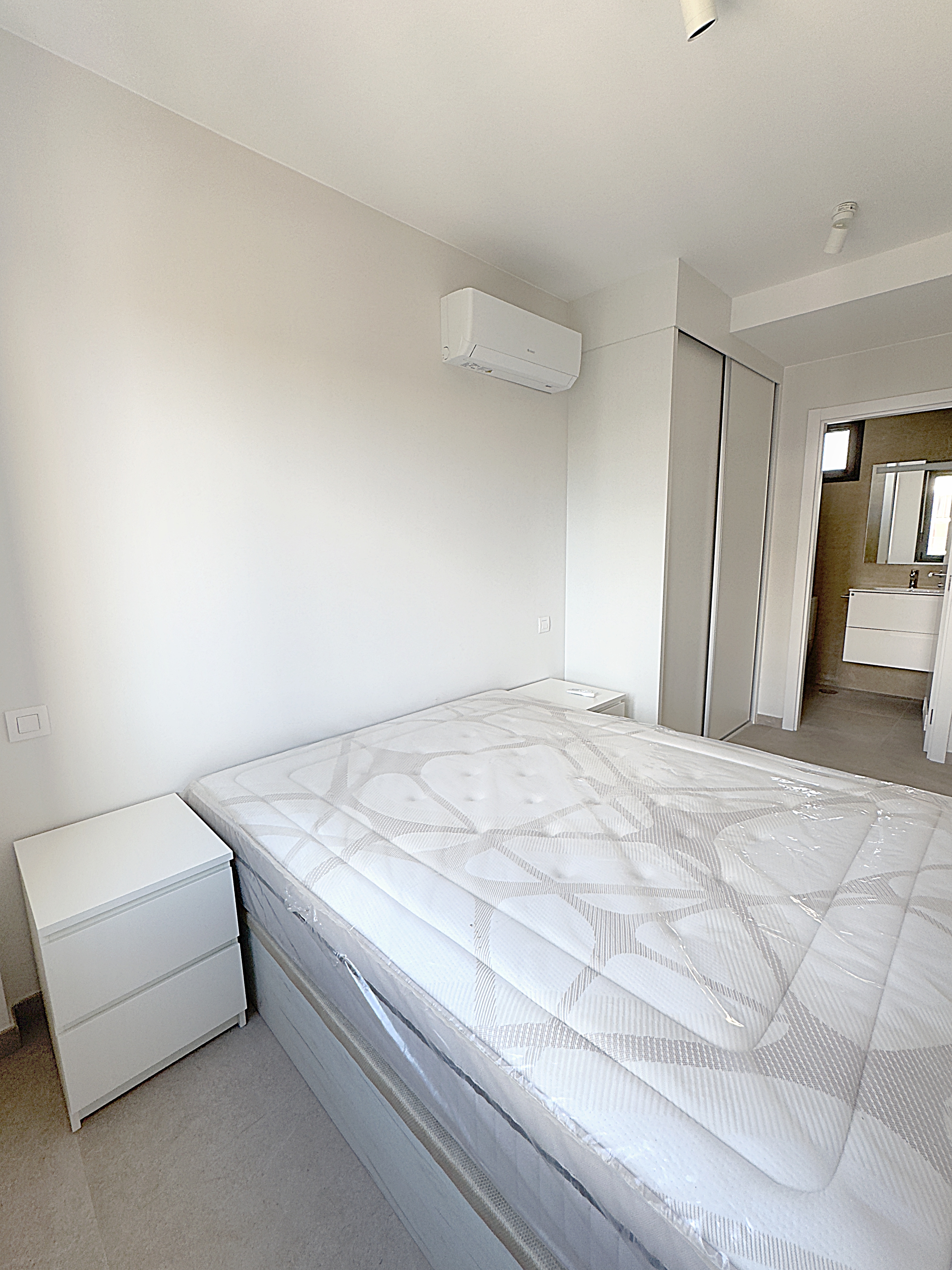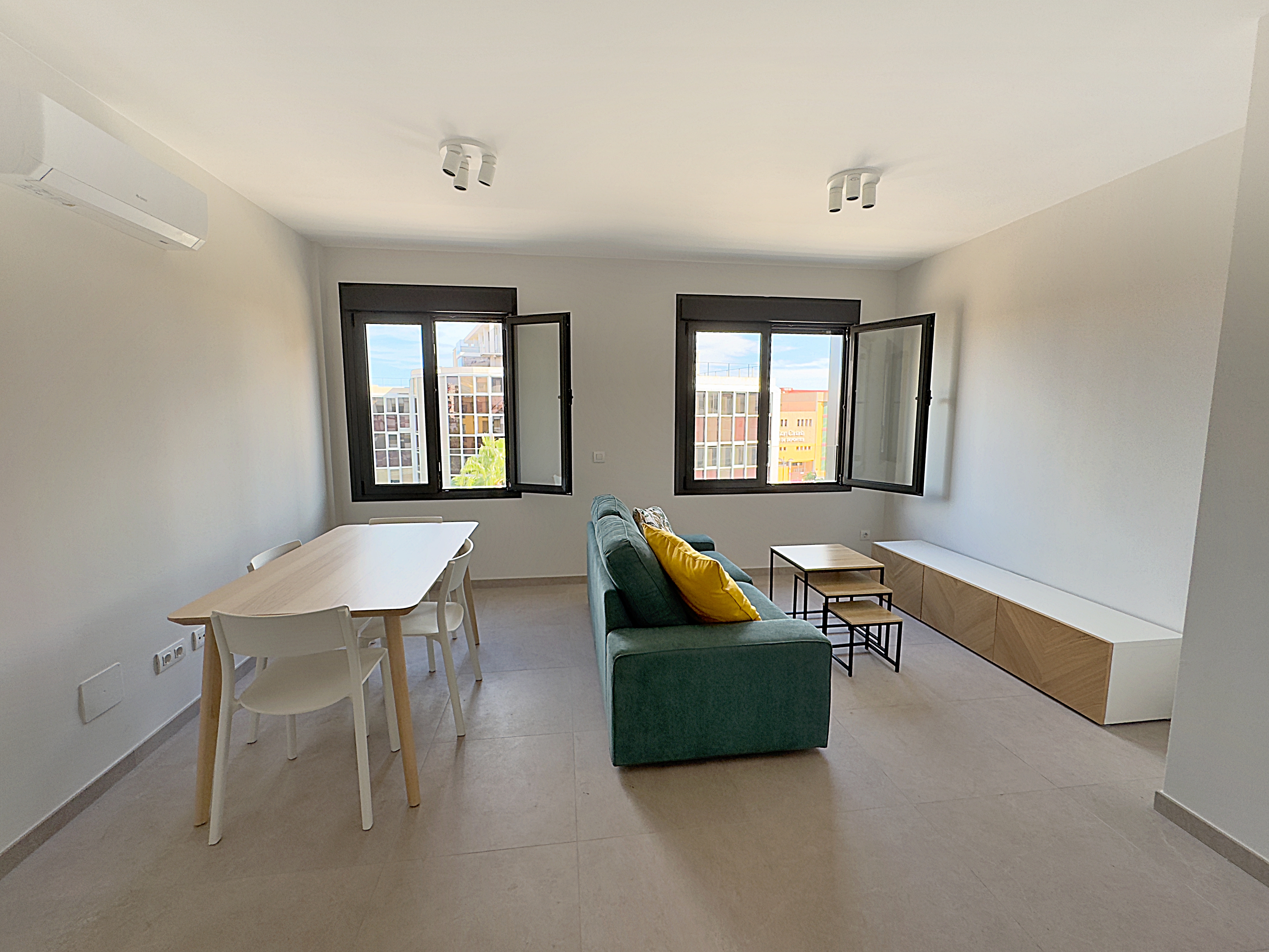 En cuanto a su distribución, ofrece una zona privada con dos dormitorios con armarios empotrados. Uno de ellos, en suite, esta completamente amueblado, con climatización y con baño completo equipado con plato de ducha. El área social ofrece una distribución en loft, (salón-comedor-cocina) y cuenta con climatización y un baño completo también con plato de ducha y armarios.